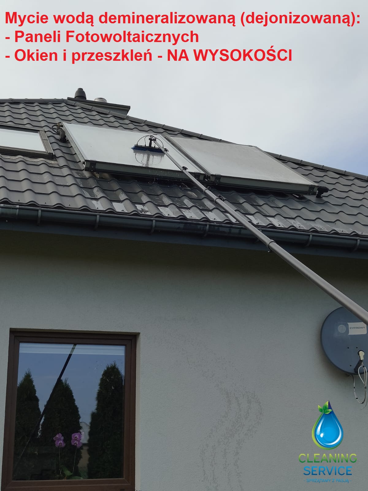 Usługę wykonujemy z gruntu przy użyciu specjalistycznych kijów teleskopowych, nawet do 13 metrów wysokości! To bezpieczne i skuteczne rozwiązanie bez potrzeby używania drabin czy podnośników.